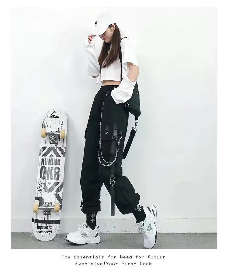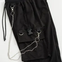 Black Cargo Pants for Women Techwear Female Goth Joggers with Chain Casual Trousers Hip Hop Sweaatpants Loose Street Rock Style