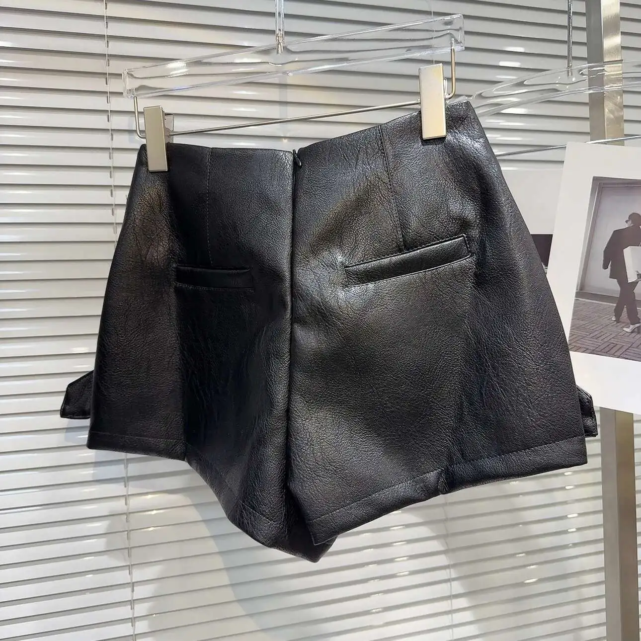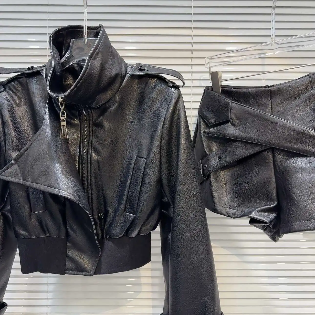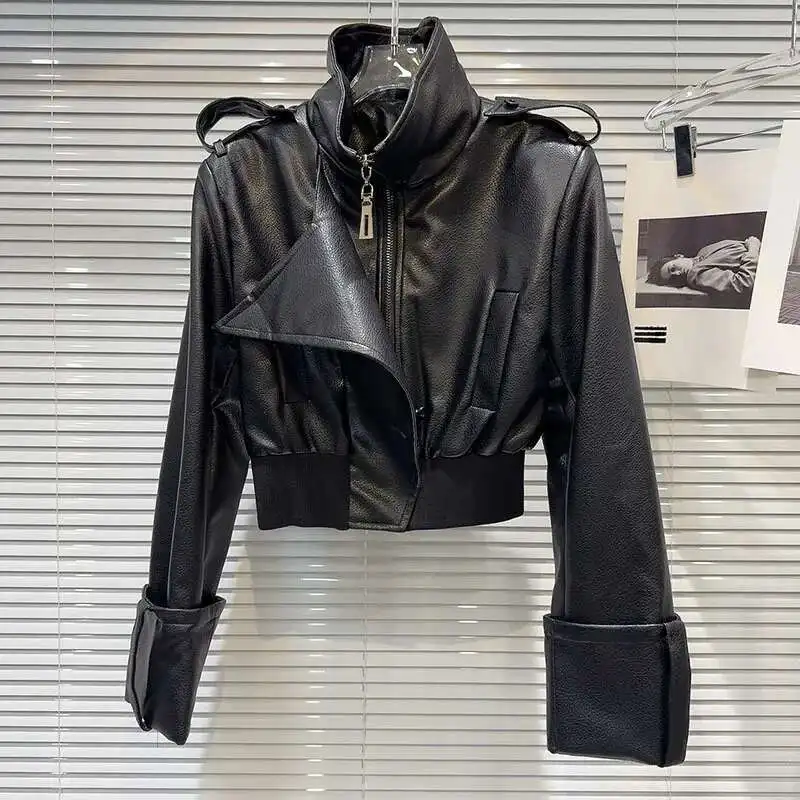 DEAT 2024 Autumn New Fashion Women's PU Leather Zipper Stand-up Collar Short Jacket High Waist Cross Shorts Female 11A0860